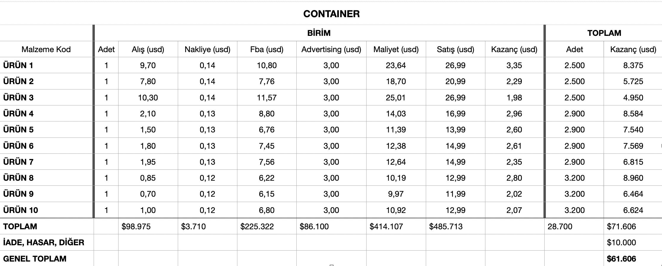 Amazon Avrupa’da açacağınız bir hesapla, dokuz Avrupa ülkesinde pazar yerinizi açarak satış yapabilirsiniz. Vergiler, nakliye, vize kolaylığı, oturum, izinler ve şirket prestiji açısından değerlendirme yapacak olursak Almanya şirketi ile çalışmanızı öneririm. Daha önceki yazılarımda belirttiğim gibi e-ihracatın bir çok ayrıntısı ve zorlukları var. Ancak bunula birlikte bir çok avantajı da barındırıyor. Bu yazımda somut bir örnekle bilgi vereceğim. Aşağıda bir konteyner ürün için yapılan çalışmayı görebilirsiniz.